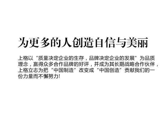 上格一路走來,以“締造時尚集團(tuán),使公司受人尊敬,令人向往;為客戶提升價值,創(chuàng)造成功;讓員工提高生活品質(zhì),實現(xiàn)自我價值”作為我們的目標(biāo),“為更多的創(chuàng)造自信與美麗” 作為我們的使命,立志為把“中國制造” 改變成“中國創(chuàng)造”貢獻(xiàn)我們的一份力量而不懈努力!